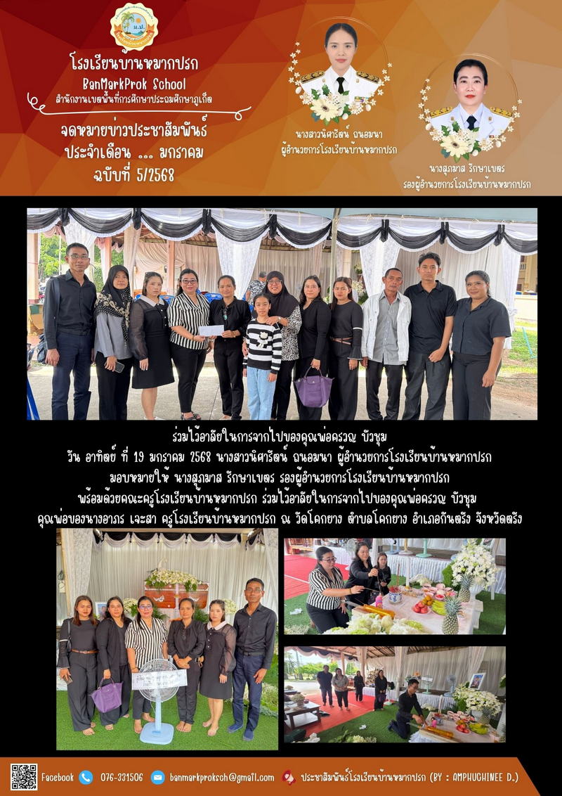 ร่วมไว้อาลัยในการจากไปของคุณพ่อครวญ บัวชุม วัน อาทิตย์ ที่ 19 มกราคม 2568 นางสาวนิศารัตน์ ถนอมนา ผู้อำนวยการโรงเรียนบ้านหมากปรก มอบหมายให้ นางสุภมาส รักษาเขตร รองผู้อำนวยการโรงเรียนบ้านหมากปรก พร้อมด้วยคณะครูโรงเรียนบ้านหมากปรก ร่วมไว้อาลัยในการจากไปของคุณพ่อครวญ บัวชุม คุณพ่อของนางอาภร เจะสา ครูโรงเรียนบ้านหมากปรก ณ วัดโคกยาง ตำบลโคกยาง อำเภอกันตรัง จังหวัดตรัง