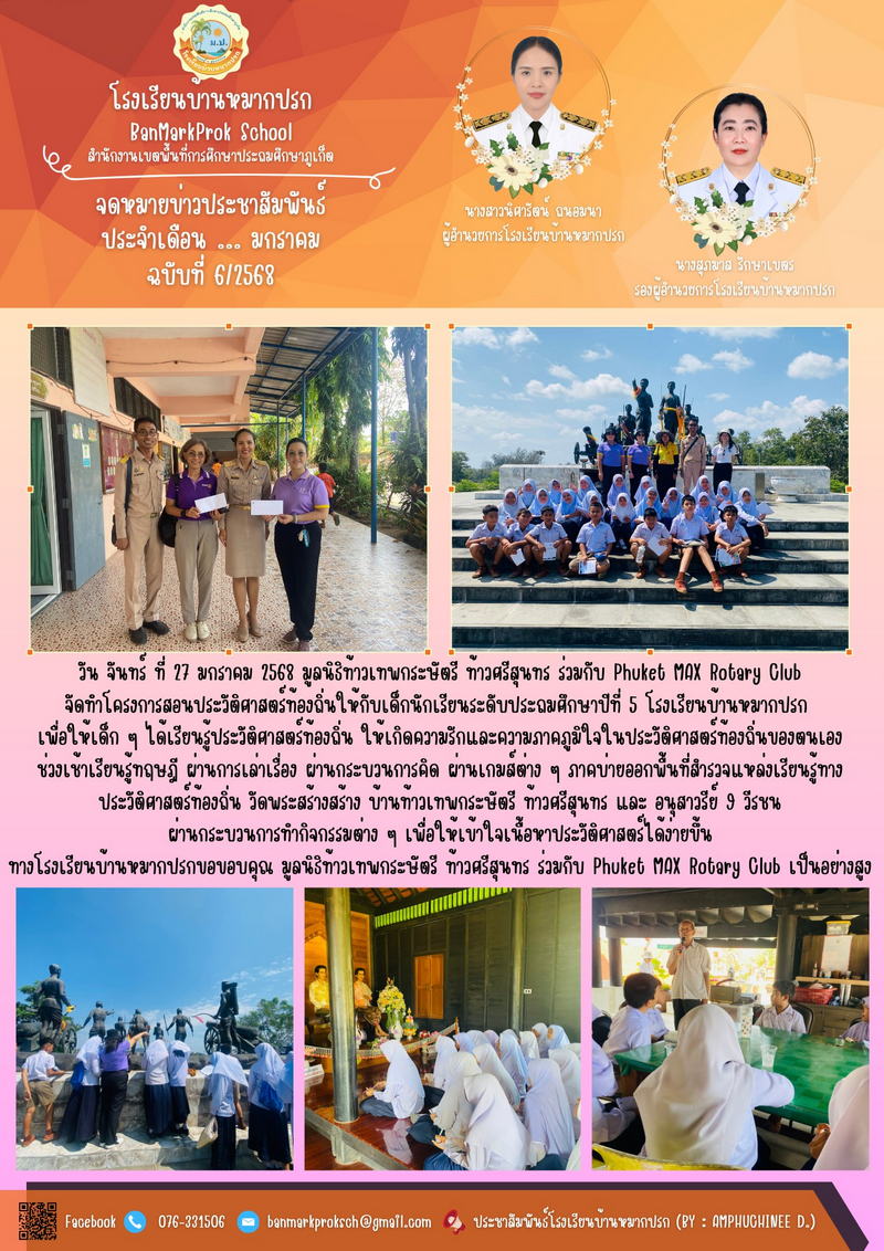 มูลนิธิท้าวเทพกระษัตรี ท้าวศรีสุนทร ร่วมกับ Phuket MAX Rotary Club จัดทำโครงการสอนประวัติศาสตร์ท้องถิ่นให้กับเด็กนักเรียนระดับประถมศึกษาปีที่ 5 โรงเรียนบ้านหมากปรก เพื่อให้เด็ก ๆ ได้เรียนรู้ประวัติศาสตร์ท้องถิ่น ให้เกิดความรักและความภาคภูมิใจในประวัติศาสตร์ท้องถิ่นของตนเอง ช่วงเช้าเรียนรู้ทฤษฎี ผ่านการเล่าเรื่อง ผ่านกระบวนการคิด ผ่านเกมส์ต่าง ๆ ภาคบ่ายออกพื้นที่สำรวจแหล่งเรียนรู้ทางประวัติศาสตร์ท้องถิ่น วัดพระสร้างสร้าง บ้านท้าวเทพกระษัตรี ท้าวศรีสุนทร และ อนุสาวรีย์ 9 วีรชน ผ่านกระบวนการทำกิจกรรมต่าง ๆ เพื่อให้เข้าใจเนื้อหาประวัติศาสตร์ได้ง่ายขึ้น ทางโรงเรียนบ้านหมากปรกขอขอบคุณ มูลนิธิท้าวเทพกระษัตรี ท้าวศรีสุนทร ร่วมกับ Phuket MAX Rotary Club เป็นอย่างสูง