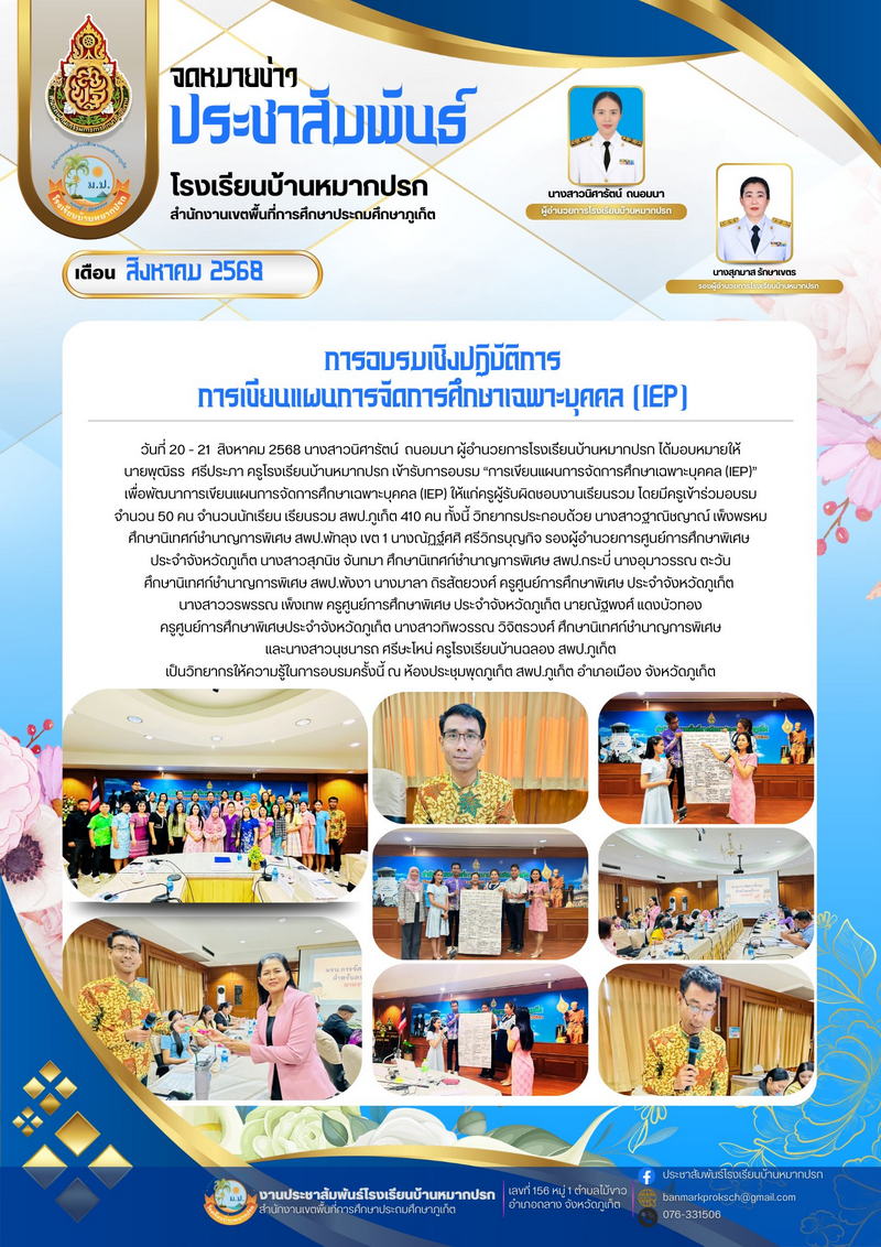 นางสาวนิศารัตน์ ถนอมนา ผู้อำนวยการโรงเรียนบ้านหมากปรก ได้มอบหมายให้ นายพุฒิธร ศรีประภา ครูโรงเรียนบ้านหมากปรก เข้ารับการอบรม “การเขียนแผนการจัดการศึกษาเฉพาะบุคคล (IEP)” เพื่อพัฒนาการเขียนแผนการจัดการศึกษาเฉพาะบุคคล (IEP) ให้แก่ครูผู้รับผิดชอบงานเรียนรวม โดยมีครูเข้าร่วมอบรมจำนวน 50 คน จำนวนนักเรียน เรียนรวม สพป.ภูเก็ต 410 คน ทั้งนี้ วิทยากรประกอบด้วย นางสาวฐาณิชญาณ์ เพ็งพรหม ศึกษานิเทศก์ชำนาญการพิเศษ สพป.พัทลุง เขต 1 นางณัฏฐ์ศศิ ศรีวิกรบุญกิจ รองผู้อำนวยการศูนย์การศึกษาพิเศษ ประจำจังหวัดภูเก็ต นางสาวสุภนิช จันทมา ศึกษานิเทศก์ชำนาญการพิเศษ สพป.กระบี่ นางอุมาวรรณ ตะวัน ศึกษานิเทศก์ชำนาญการพิเศษ สพป.พังงา นางมาลา ถิรสัตยวงศ์ ครูศูนย์การศึกษาพิเศษ ประจำจังหวัดภูเก็ต นางสาววรพรรณ เพ็งเทพ ครูศูนย์การศึกษาพิเศษ ประจำจังหวัดภูเก็ต นายณัฐพงศ์ แดงบัวทองครูศูนย์การศึกษาพิเศษประจำจังหวัดภูเก็ต นางสาวทิพวรรณ วิจิตรวงศ์ ศึกษานิเทศก์ชำนาญการพิเศษและนางสาวนุชนารถ ศรีษะโหน่ ครูโรงเรียนบ้านฉลอง สพป.ภูเก็ต เป็นวิทยากรให้ความรู้ในการอบรมครั้งนี้ ณ ห้องประชุมพุดภูเก็ต สพป.ภูเก็ต อำเภอเมือง จังหวัดภูเก็ต