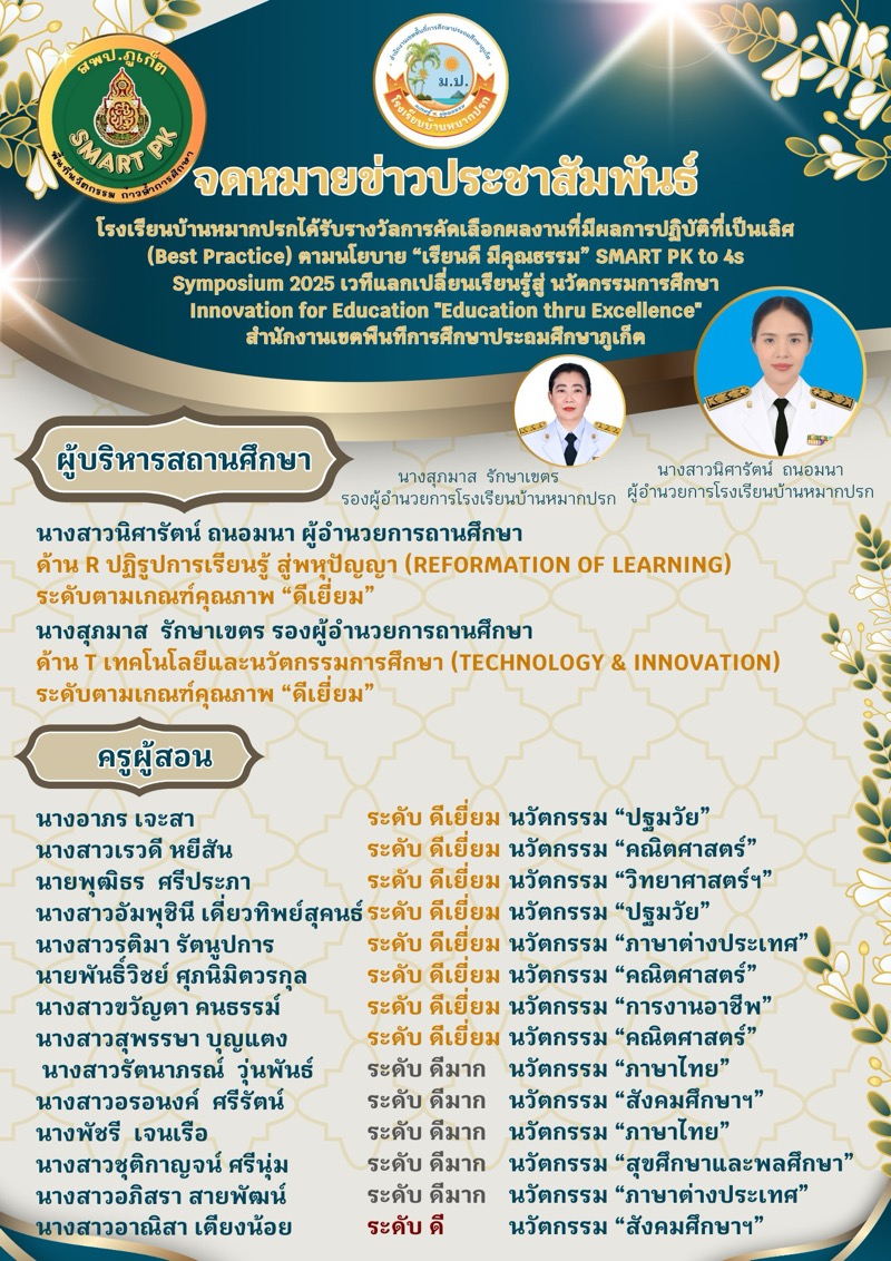 โรงเรียนบ้านหมากปรกได้รับรางวัลการคัดเลือกผลงานที่มีผลการปฏิบัติที่เป็นเลิศ (Best Practice) ตามนโยบาย “เรียนดี มีคุณธรรรม” SMART PK to 4s Symposium 2025 เวทีแลกเปลี่ยนเรียนรู้สู่ นวัตกรรมการศึกษา Innovation for Education “Education thru Excellence” สำนักงานเขตพื้นที่การศึกษาประถมศึกษาภูเก็ต