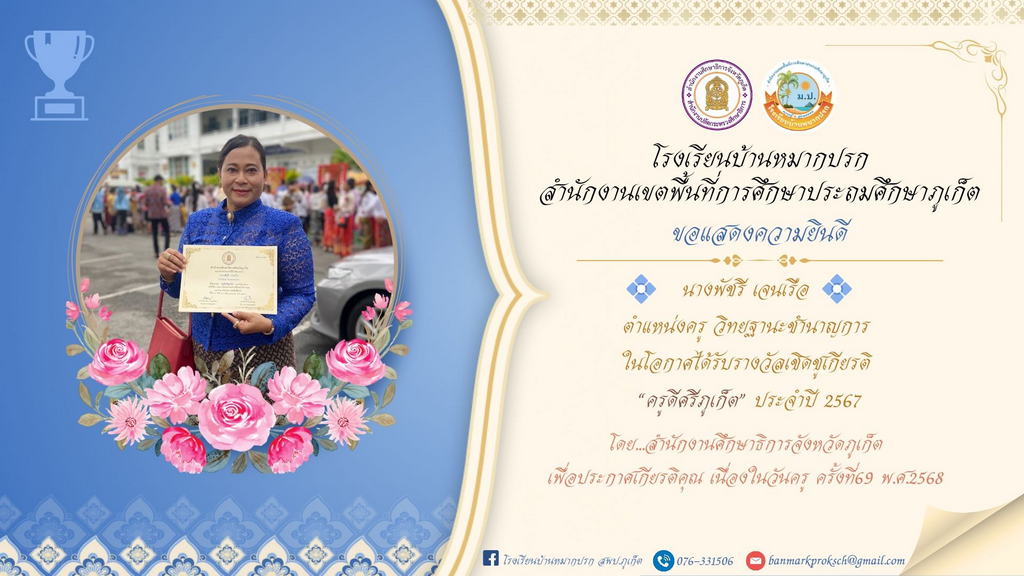 นางสาวนิศารัตน์ ถนอมนา ผู้อำนวยการโรงเรียนบ้านหมากปรก นางสุภมาส รักษาเขตร รองผู้อำนวยการโรงเรียนบ้านหมากปรก คณะครู บุคลากร และนักเรียนโรงเรียนบ้านหมากปรก ขอแสดงความยินดี กับ นางพัชรี เจนเรือ ตำแหน่งครู วิทยฐานะชำนาญการ ในโอกาศได้รับรางวัลเชิดชูเกียรติ “ครูดีศรีภูเก็ต” ประจำปี ๒๕๖๗
