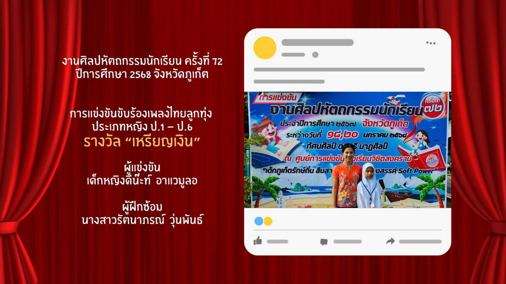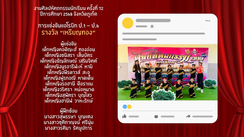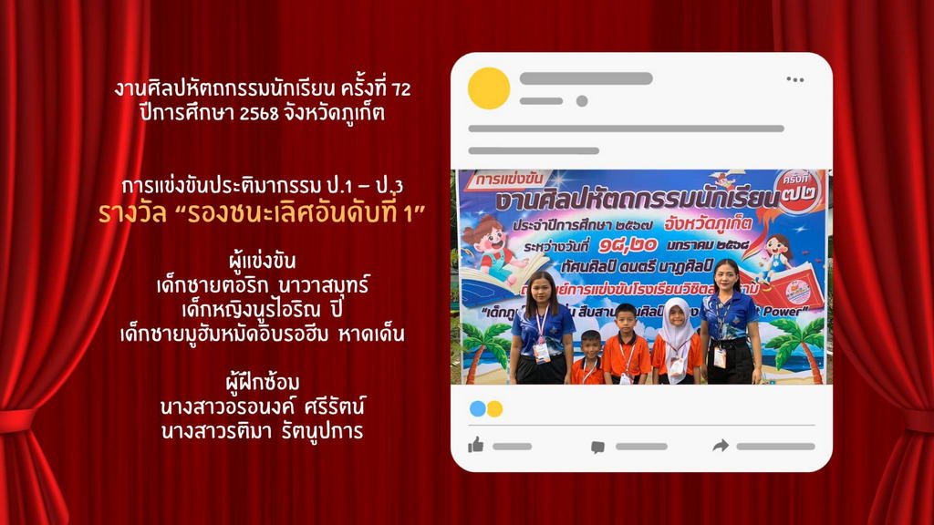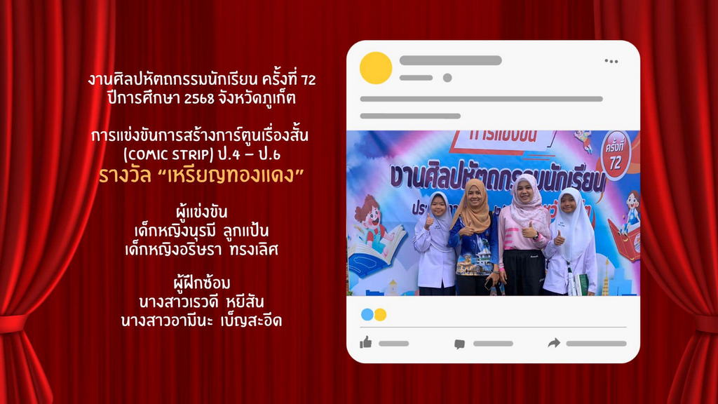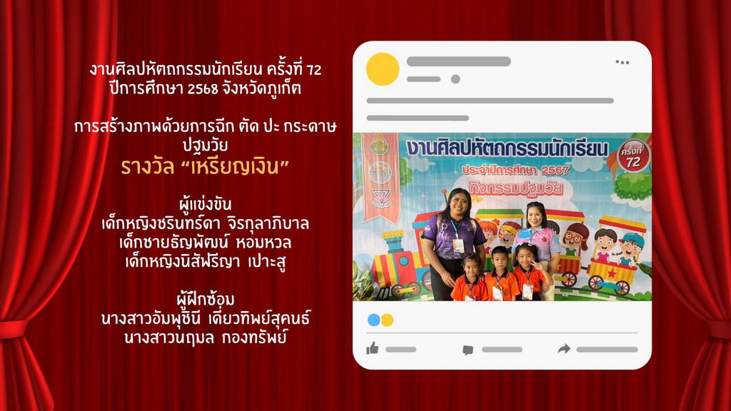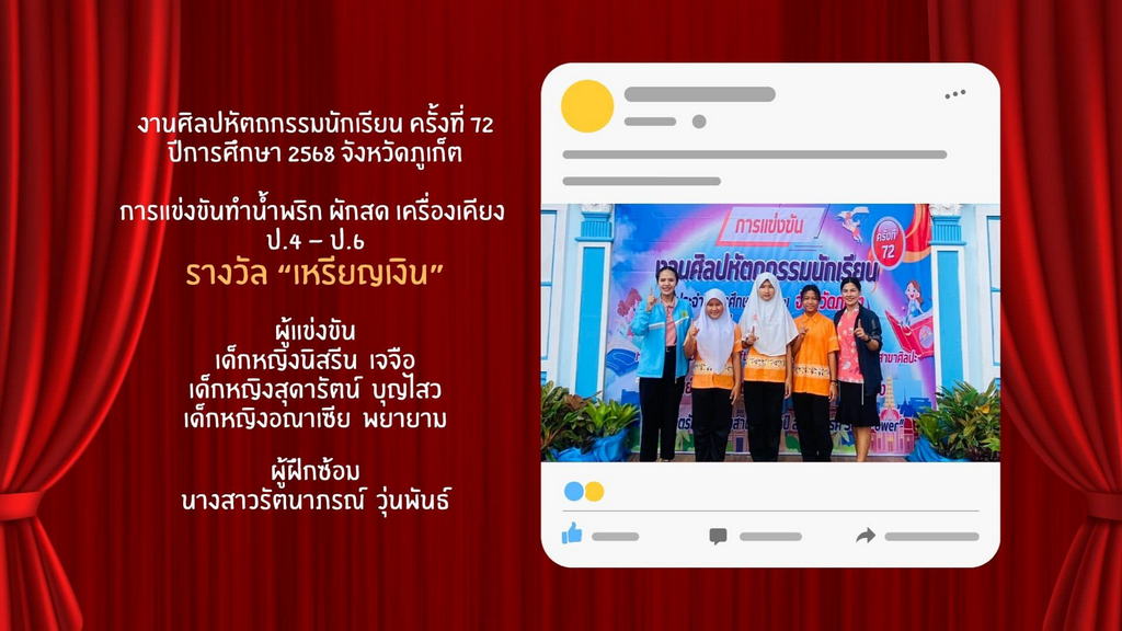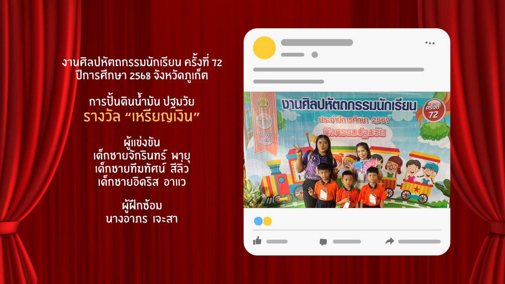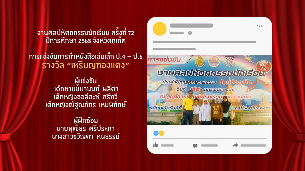นางสาวนิศารัตน์ ถนอมนา ผู้อำนวยการโรงเรียนบ้านหมากปรก นางสุภมาส รักษาเขตร รองผู้อำนวยการโรงเรียนบ้านหมากปรก คณะครู บุคลากร และนักเรียนโรงเรียนบ้านหมากปรก ขอแสดงความยินดี กับ คณะครูและนักเรียนที่ได้เข้าร่วมการแข่งขันศิลปหัตถกรรมนักเรียน ครั้งที่ 72 สังกัดสำนักงานเขตพื้นที่การศึกษาประถมศึกษาภูเก็ต โดยสรุปเหรียญรางวัลจากการแข่งขันทั้งหมด 15 รายการ ดังต่อไปนี้🫶🏻