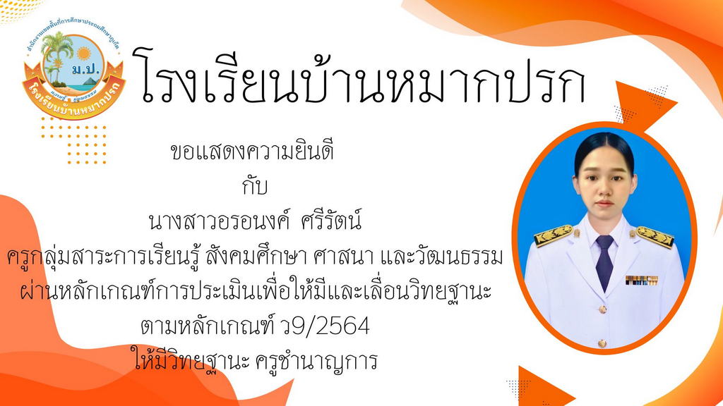 นางสาวนิศารัตน์ ถนอมนา ผู้อำนวยการโรงเรียนบ้านหมากปรก นางสุภมาส รักษาเขตร รองผู้อำนวยการโรงเรียนบ้านหมากปรก คณะครู บุคลากร และนักเรียนโรงเรียนบ้านหมากปรก ขอแสดงความยินดี กับนางสาวอรอนงค์ ศรีรัตน์ ครูกลุ่มสาระการเรียนรู้ สังคมศึกษา ศาสนา และวัฒนธรรม ผ่านหลักเกณฑ์การประเมินเพื่อให้มีและเลื่อนวิทยฐานะ ตามหลักเกณฑ์ ว9/2564 ให้มีวิทยฐานะ ครูชำนาญการ